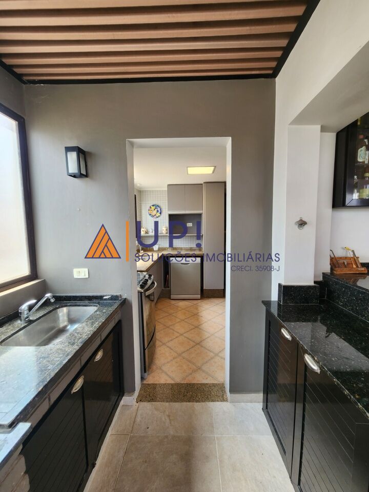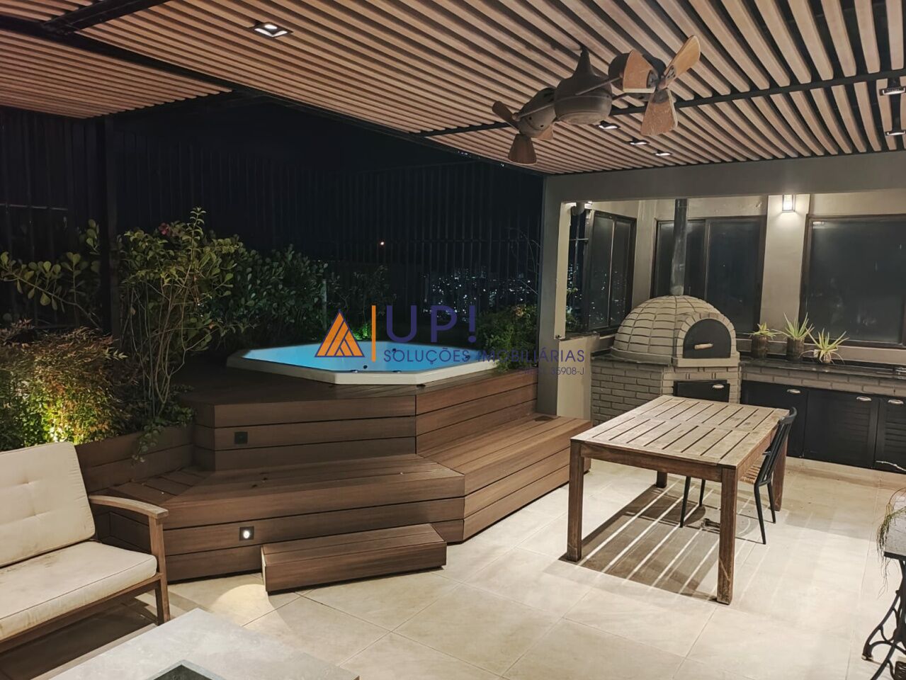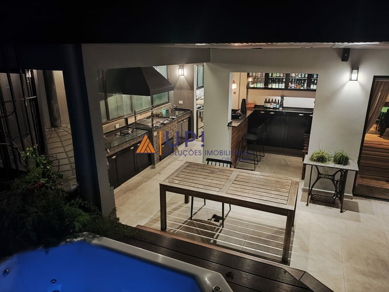 Sala, cozinha, lavabo, área externa parcialmente coberta com churrasqueira, forno de pizza e banheira de hidromassagem.