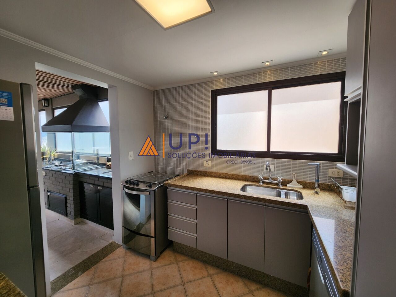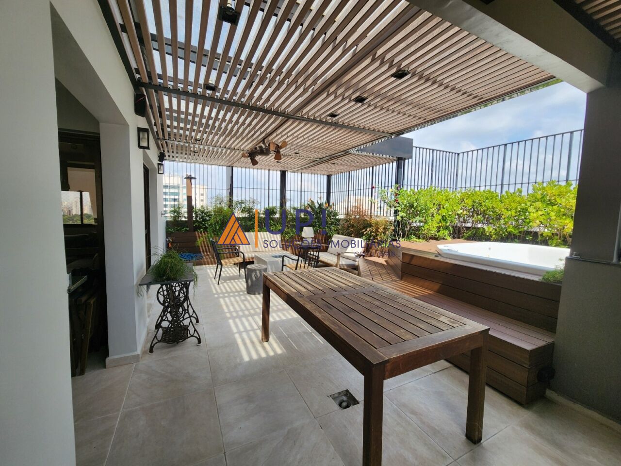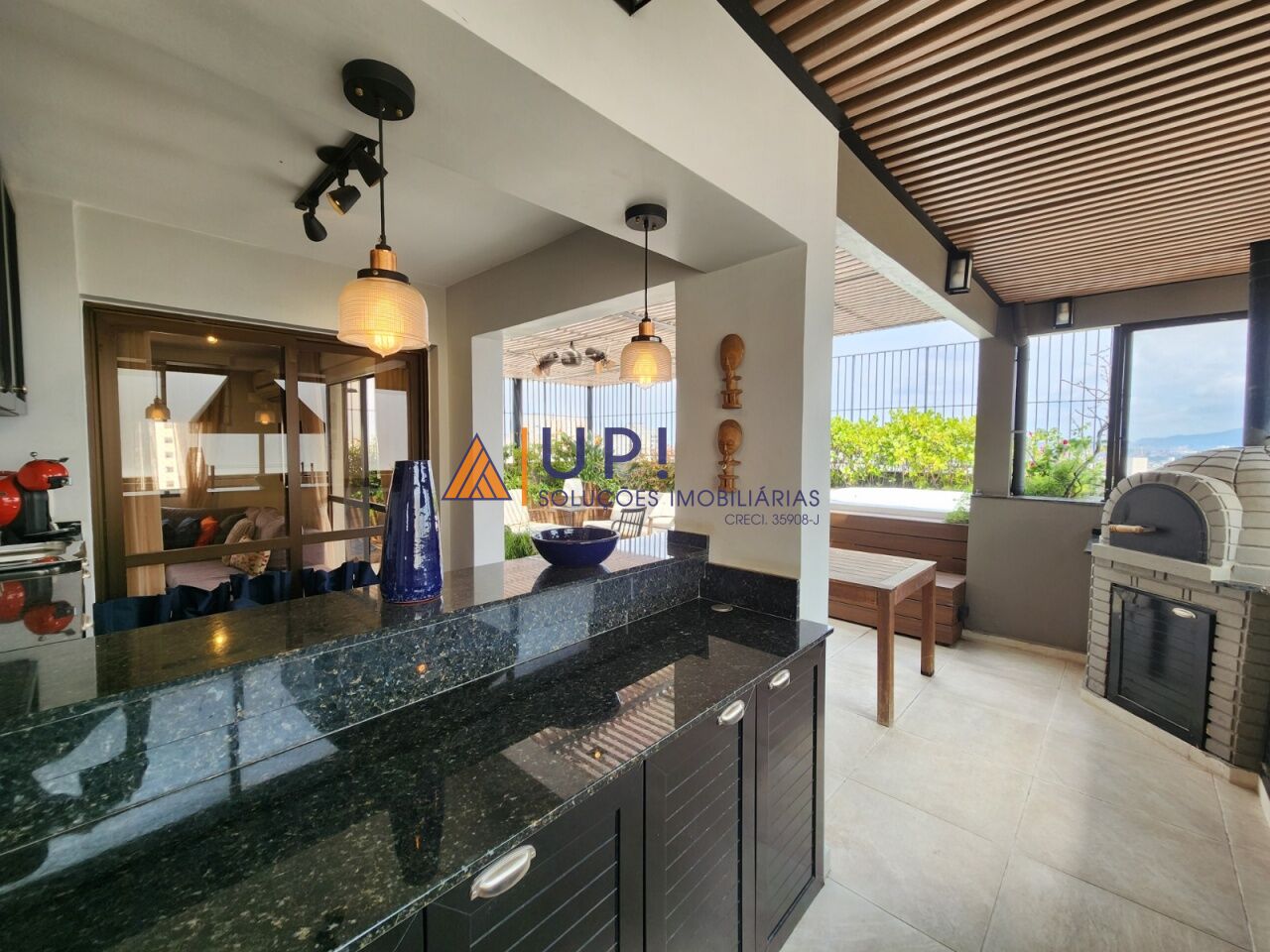 Sala, cozinha, lavabo, área externa parcialmente coberta com churrasqueira, forno de pizza e banheira de hidromassagem.