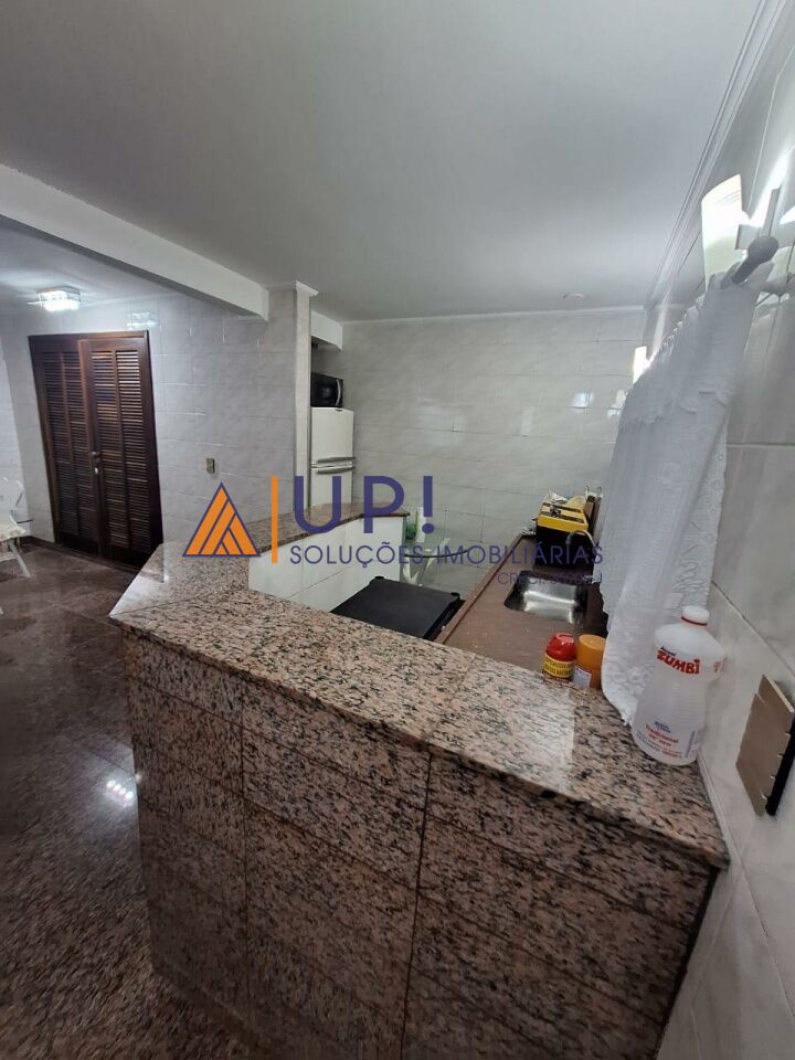 Salão de festas, com cozinha americana, amplo armário e banheiro.